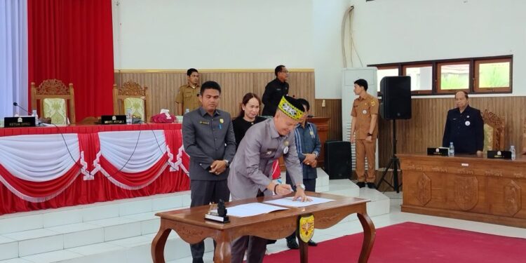 KUALA KURUN, inikalteng.com – Anggaran Pendapatan dan Belanja Daerah (APBD) Kabupaten Gunung Mas Tahun Anggaran 2026 akhirnya resmi disetujui. Persetujuan itu ditandai dengan penandatanganan Persetujuan Bersama antara Bupati Gunung Mas Jaya Samaya Monong dan DPRD, dalam Rapat Paripurna ke-9 Masa Persidangan I Tahun Sidang 2025, Senin (24/11/2025).