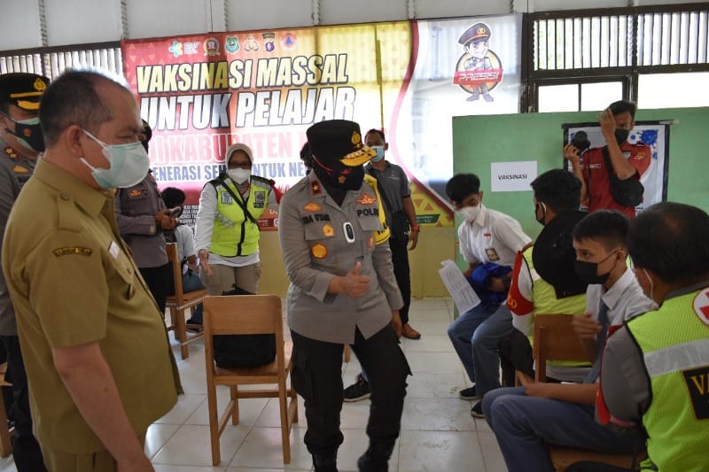 KUALA KAPUAS, inikalteng.com – Bupati Kapuas Ben Brahim S Bahat meninjau langsung kegiatan vaksinasi massal yang dilaksanakan oleh Polda Kalimantan Tengah, bertempat di Gedung Sekolah Menengah Kejuruan Negeri (SMKN) 1 Kuala Kapuas, Senin (20/9/2021).