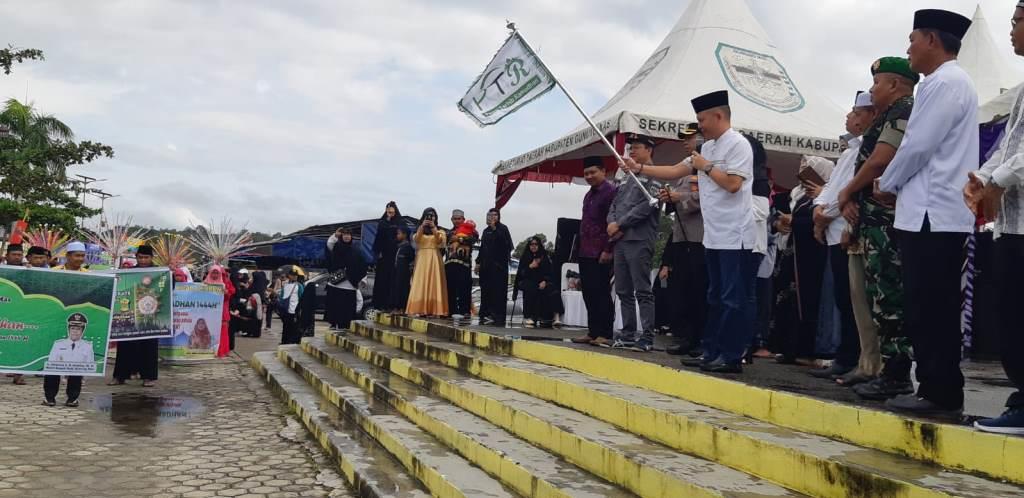 KUALA KURUN, inikalteng.com – Bupati Kabupaten Gunung Mas (Gumas) Jaya Samaya Monong melepas peserta pawai Tarhib Ramadhan 1444 Hijriah yang dari di Taman Kota Kuala Kurun, Sabtu (18/3/2023). Pawai diikuti ratusan peserta dari ASN, pelajar SD, SMP, santri, dan ormas Islam.