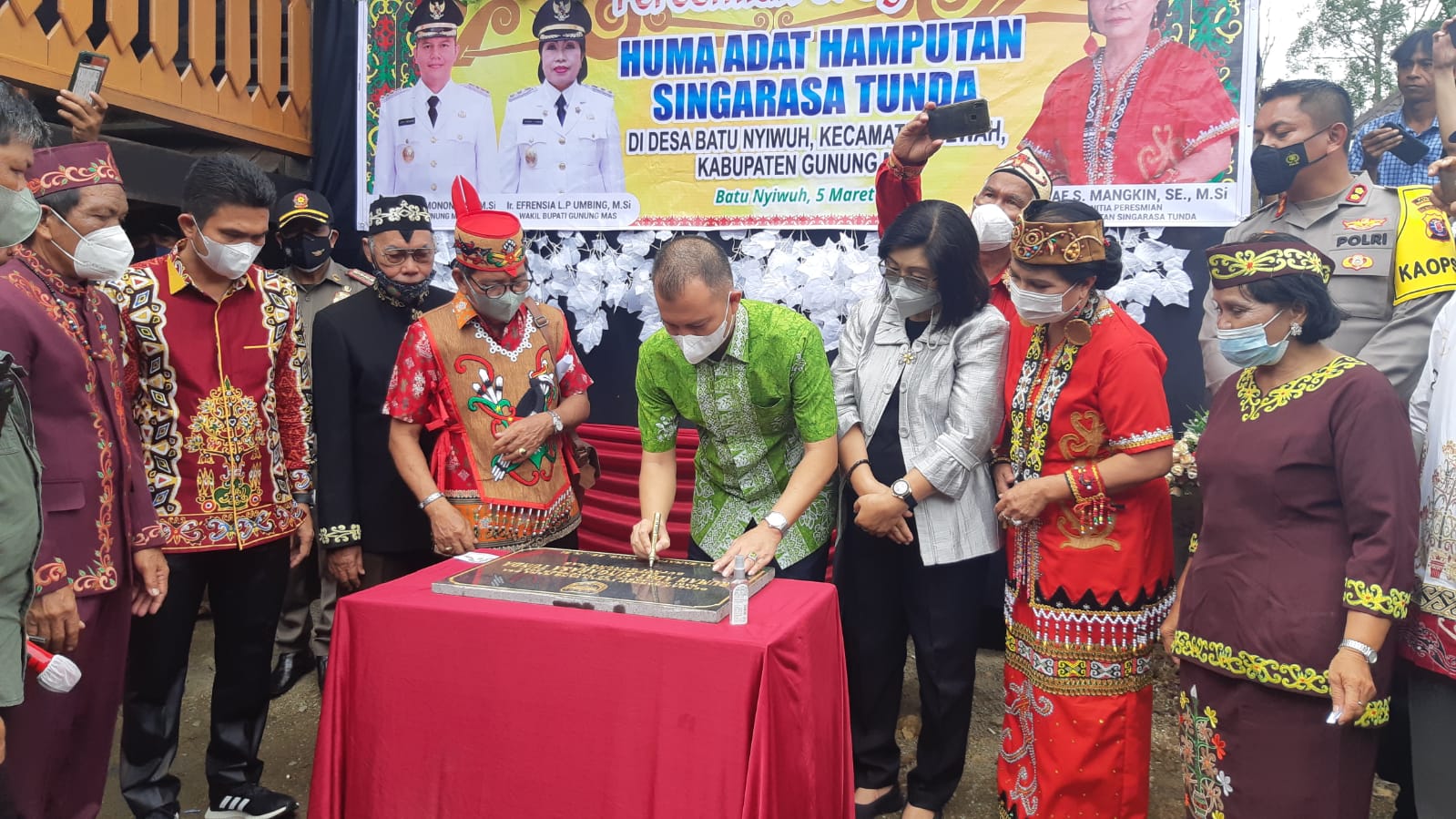 KUALA KURUN, inikalteng.com – Bupati Kabupaten Gunung Mas (Gumas) Jaya Samaya Monong meresmikan penggunaan Rumah Adat Hamputan (Keturunan) Stefanus Singarasa yang berada di Desa Batu Nyiwuh, Kecamatan Tewah, Sabtu (5/3/2022).