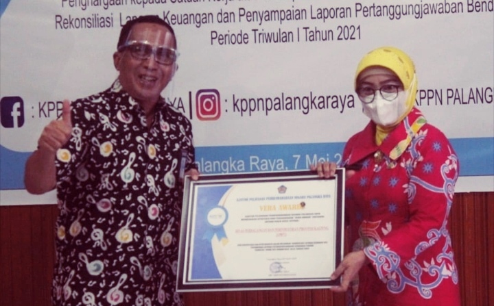 Penghargaan tersebut diserahkan langsung Kepala KPPN Palangka Raya Muhtar Salim yang diterima Kepala Disdagperin Provinsi Kalteng Aster Bonawaty, bertempat di Aula KPPN Palangka Raya, Jumat (7/5/2021).