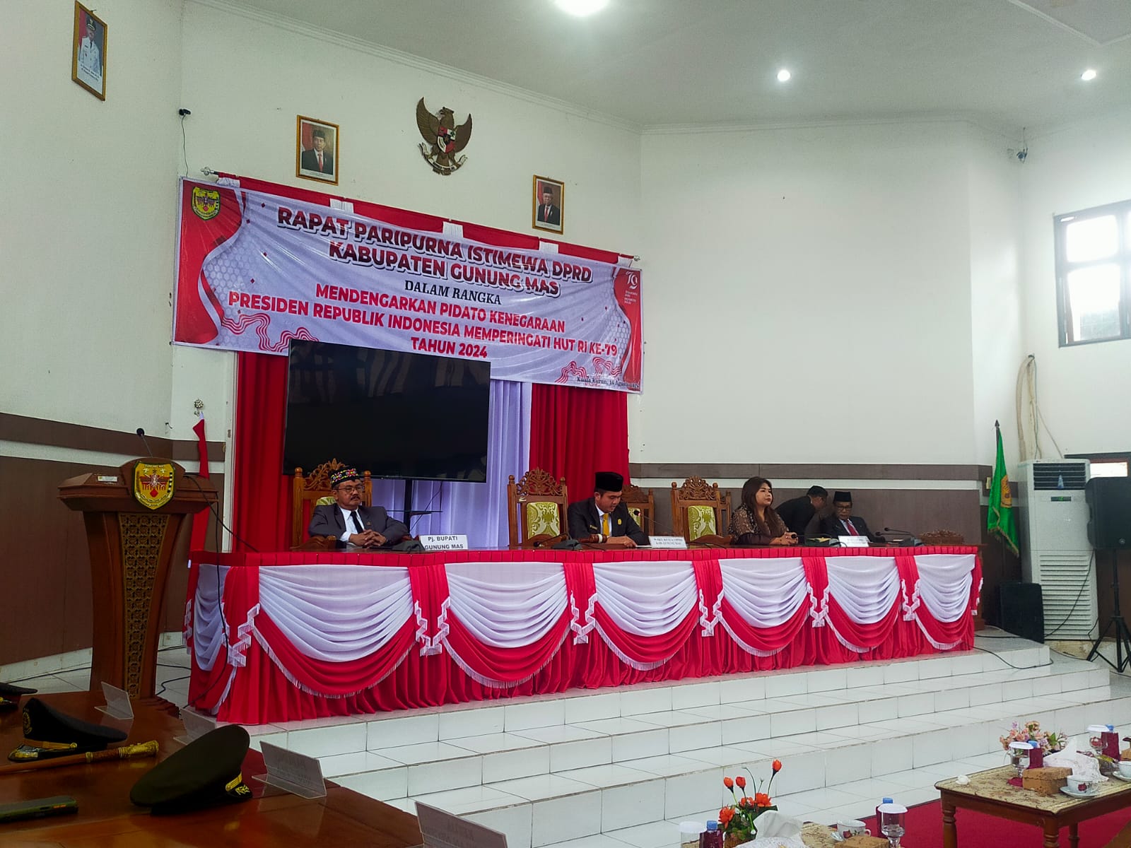 KUALA KURUN, inikalteng.com – Dewan Perwakilan Rakyat Daerah (DPRD) Kabupaten Gunung Mas menggelar rapat paripurna istimewa mendengarkan pidato kenegaraan Presiden dalam rangka Hari Ulang Tahun (HUT) ke-79 Republik Indonesia tahun 2024.