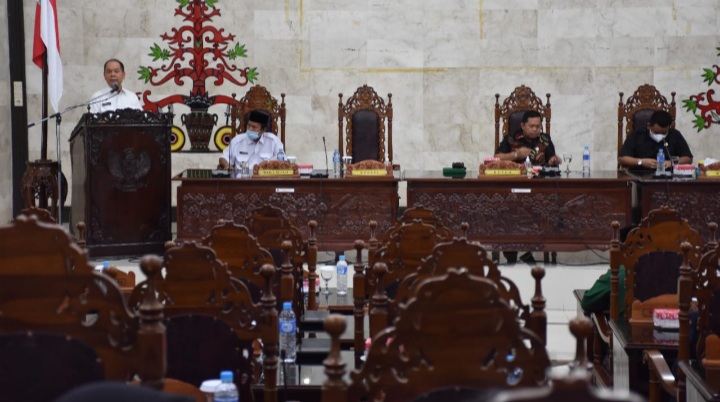 Paripurna kali ini dengan agenda penyampaian jawaban eksekutif atas pemandangan umum fraksi pendukung DPRD Kapuas terhadap Raperda Pertanggungjawaban Pelaksanaan APBD tahun 2021.