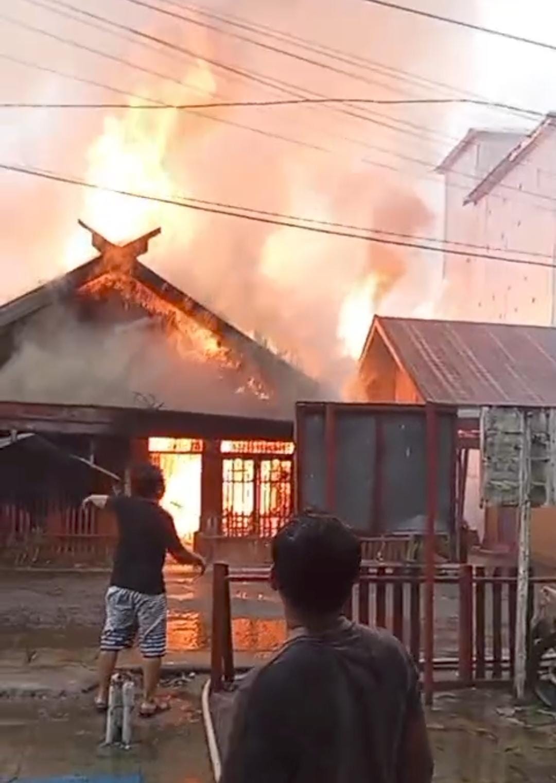 Meskipun hujan deras mengguyur daerah tersebut, api dengan cepat melahap setidaknya dua rumah warga yang terbuat dari kayu.