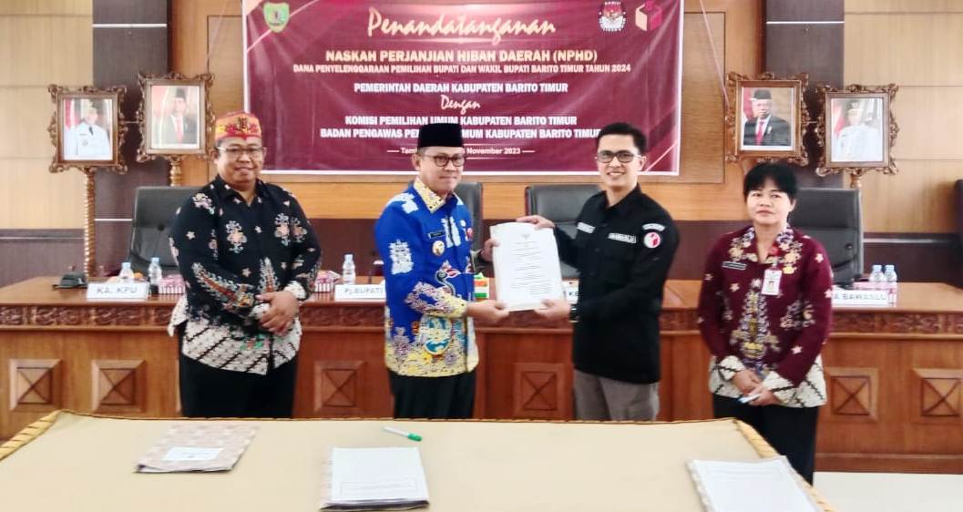 TAMIANG LAYANG, inikalteng.com – Pemkab Barito Timur (Bartim) bersama Komisi Pemilihan Umum (KPU) dan Badan Pengawas Pemilu (Bawaslu) setempat, melakukan Penandatanganan Naskah Perjanjian Hibah Daerah (NPHD), dalam rangka penyelenggaraan Pemilihan Bupati dan Wakil Bupati Bartim 2024.