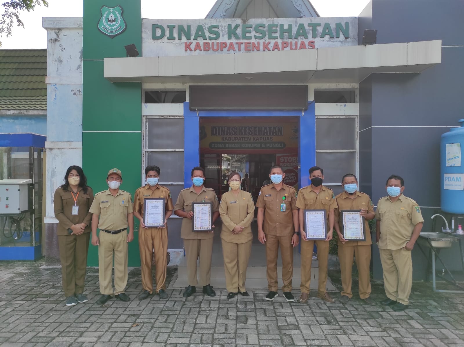 KUALA KAPUAS, inikalteng.com – Dinas Kesehatan Kabupaten Kapuas menyerahkan piagam penghargaan kepada lima puskesmas yang hadir mewakili 26 puskesmas. Penyerahan dilakukan di halaman kantor Dinas Kesehatan Kabupaten Kapuas usai pelaksanaan apel pagi, Senin (30/1/2022).