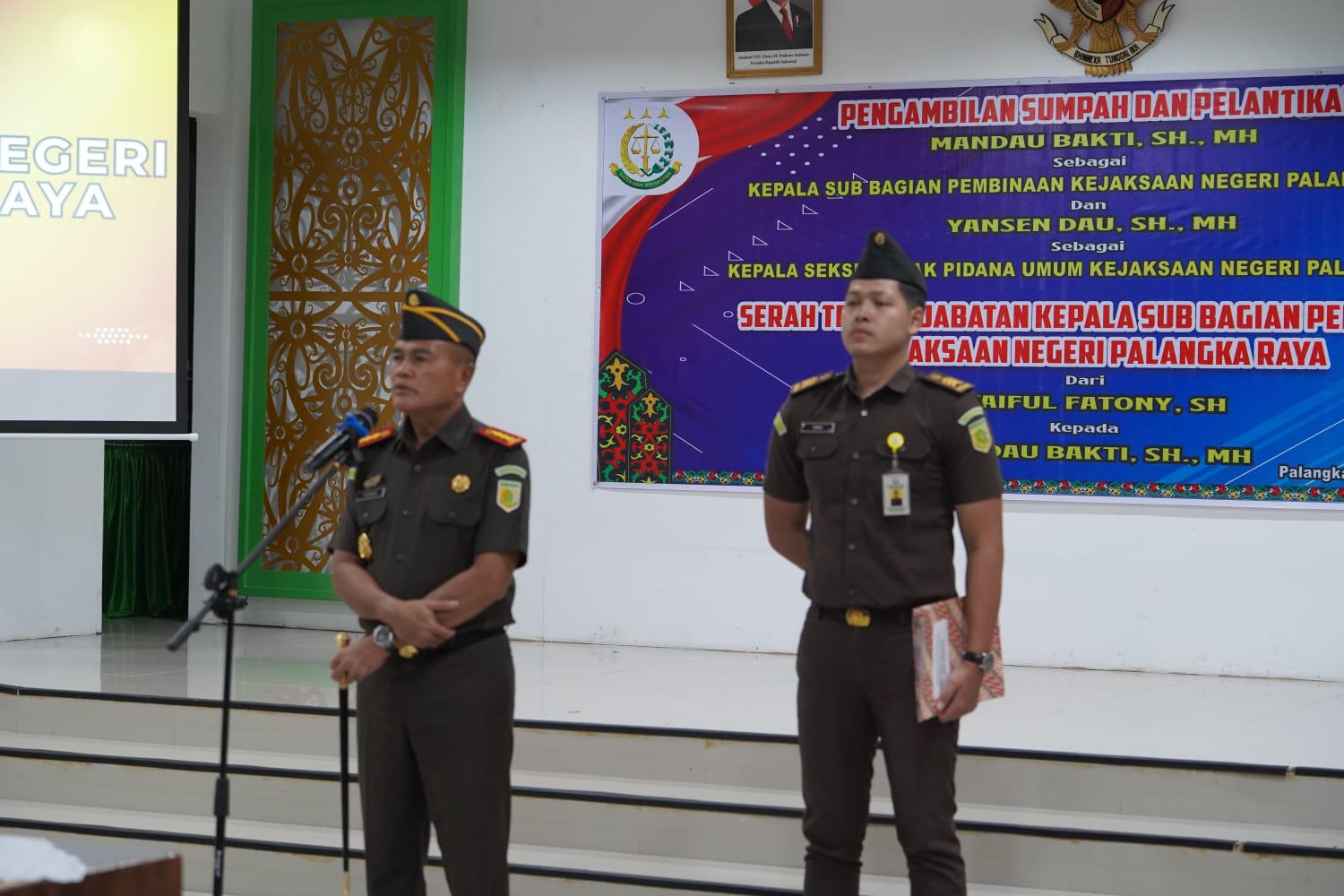 PALANGKA RAYA,inikalteng.com– Kepala Kejaksaan Negeri (Kajari) Palangka Raya, Yunardi, resmi melantik dan mengambil sumpah jabatan Yansen Dau, SH, MH sebagai Kepala Seksi Tindak Pidana Umum (Kasi Pidum) serta Mandau Bakti, SH, MH sebagai Kepala Sub Bagian Pembinaan (Kasubagbin) di lingkungan Kejaksaan Negeri Palangka Raya, pada kegiatan pelantikan yang berlangsung khidmat.