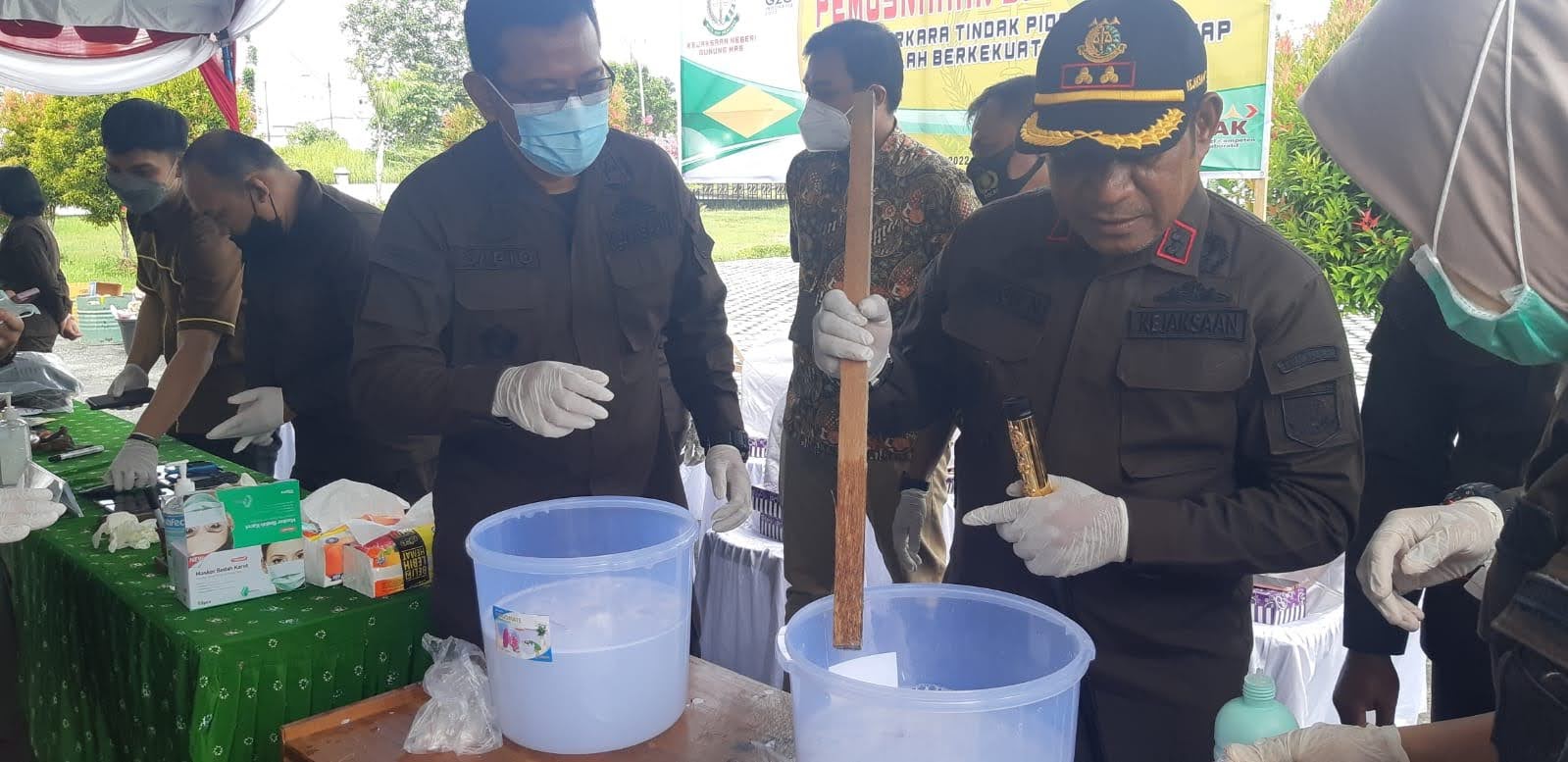 “Proses pelaksanaan pemusnahan barang bukti dilakukan dengan cara dibakar, dipotong menggunakan mesin gerinda. Khusus barang bukti narkotika dimusnahkan dengan cara dilarutkan dalam air berisi cairan pembersih lantai dan sabun cuci,” ujar Kajari Gumas Nixon Nikolaus Nila.