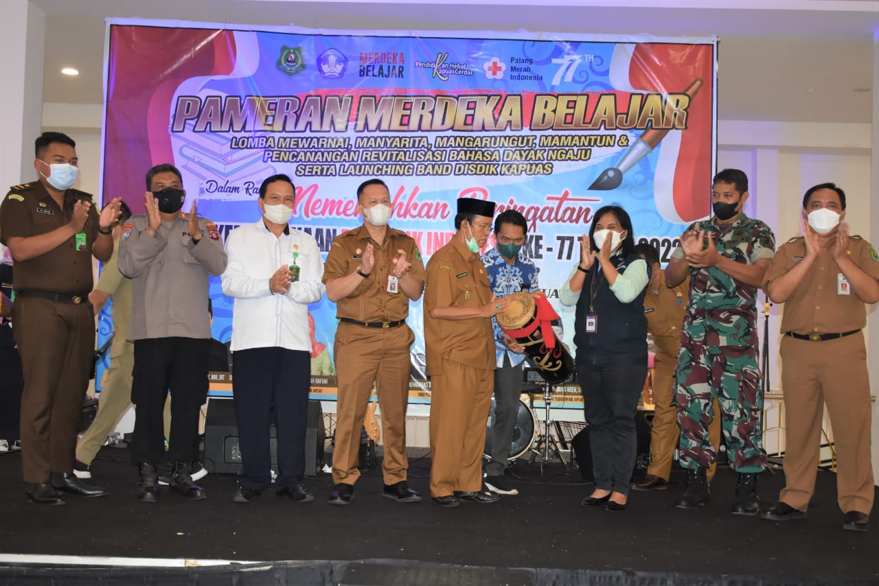KUALA KAPUAS, inikalteng.com – Wakil Bupati Kapuas HM Nafiah Ibnor membuka acara Pameran Merdeka Belajar lomba mewarnai, manyarita, mangarungut, mamantun dan pencangangan ravitalisasi bahasa Dayak Ngaju serta Launching Band Disdik Kapuas dalam rangka memeriahkan HUT Ke-77 Kemerdekaan RI 2022, di salah satu pusat perbelanjaan Kuala Kapuas, Senin (15/8/2022).