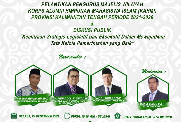 PALANGKA RAYA, inikalteng.com – Pelantikan Majelis Wilayah Korps Alumni Himpunan Mahasiswa Islam Kalimantan Tengah (MW KAHMI Kalteng) masa bakti 2021-2025 diketuai Ir H Abdul Razak yang dijadwalkan pada Selasa, 7 Desember 2021 mendatang, akan dihadiri pula oleh tokoh nasional. Kegiatan yang akan digelar di Hotel Bahalap, Jalan RTA Milono Palangka Raya ini, dikemas dalam Diskusi Publik.