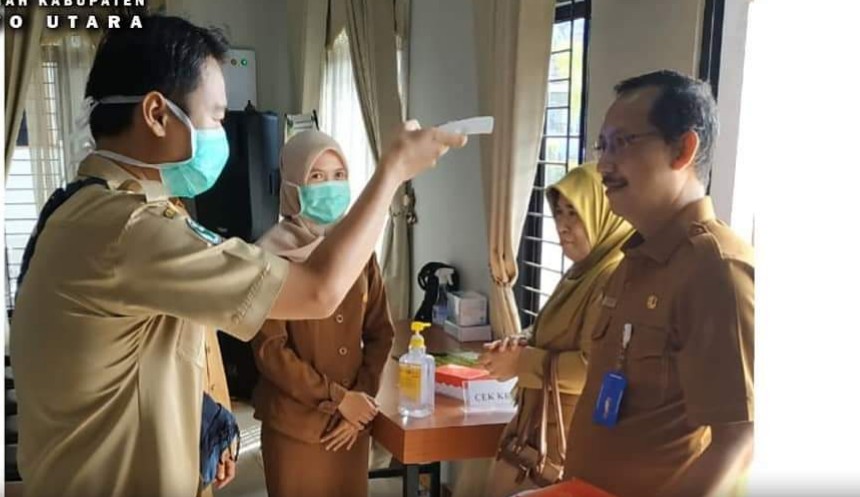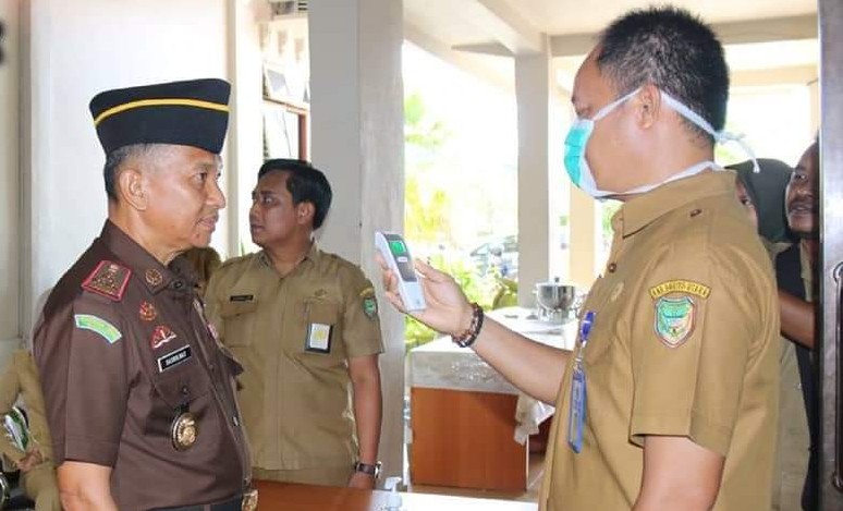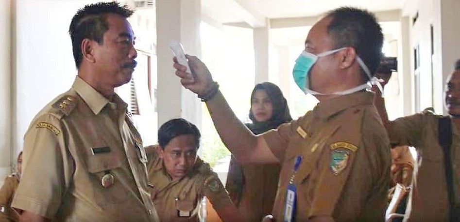 Langkah pertama yang dilakukan adalah dengan melakukan scanning suhu tubuh pada saat dilaksanakan rapat-rapat yang digelar Pemerintah Daerah. Hal ini, untuk memastikan bahwa peserta rapat yang hadir dalam kondisi sehat. Apabila ditemukan peserta rapat dalam kondisi yang “dicurigai”, maka akan dilakukan tindakan medis sesuai protokol penanganan virus Covid-19. Kemudian, terus menggalakan langkah preventif lainnya dengan himbauan-himbauan dan kegiatan lainnya.