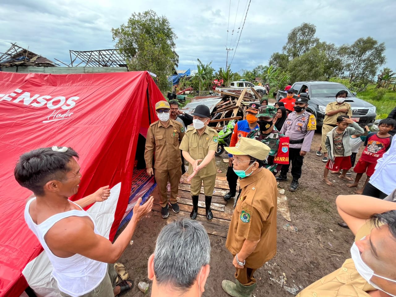 Bupati Kapuas Ben Brahim S Bahat didampingi Wakil Bupati Kapuas HM Nafiah Ibnor meninjau langsung lokasi bencana angin puting beliung tersebut melanda masyarakat di Handil Cempaka, Desa Anjir Serapat Timur, Kecamatan Kapuas Timur, Senin (10/5/2022).