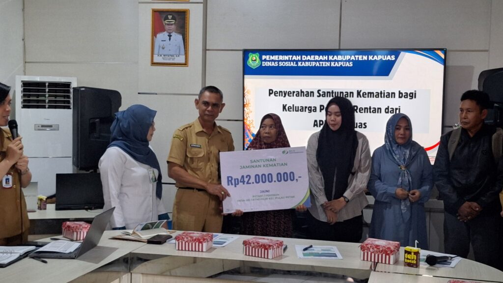 Masing-masing ahli waris menerima santunan sebesar Rp42 juta. Penyerahan santunan dilakukan di Aula Kantor Dinas Sosial, Jalan Patih Rumbih, Kuala Kapuas, Selasa (5/8/2025), sebelum dimulainya rapat pembahasan data tambahan usulan peserta dari Data Tunggal Sosial Ekonomi Nasional (DTSEN).