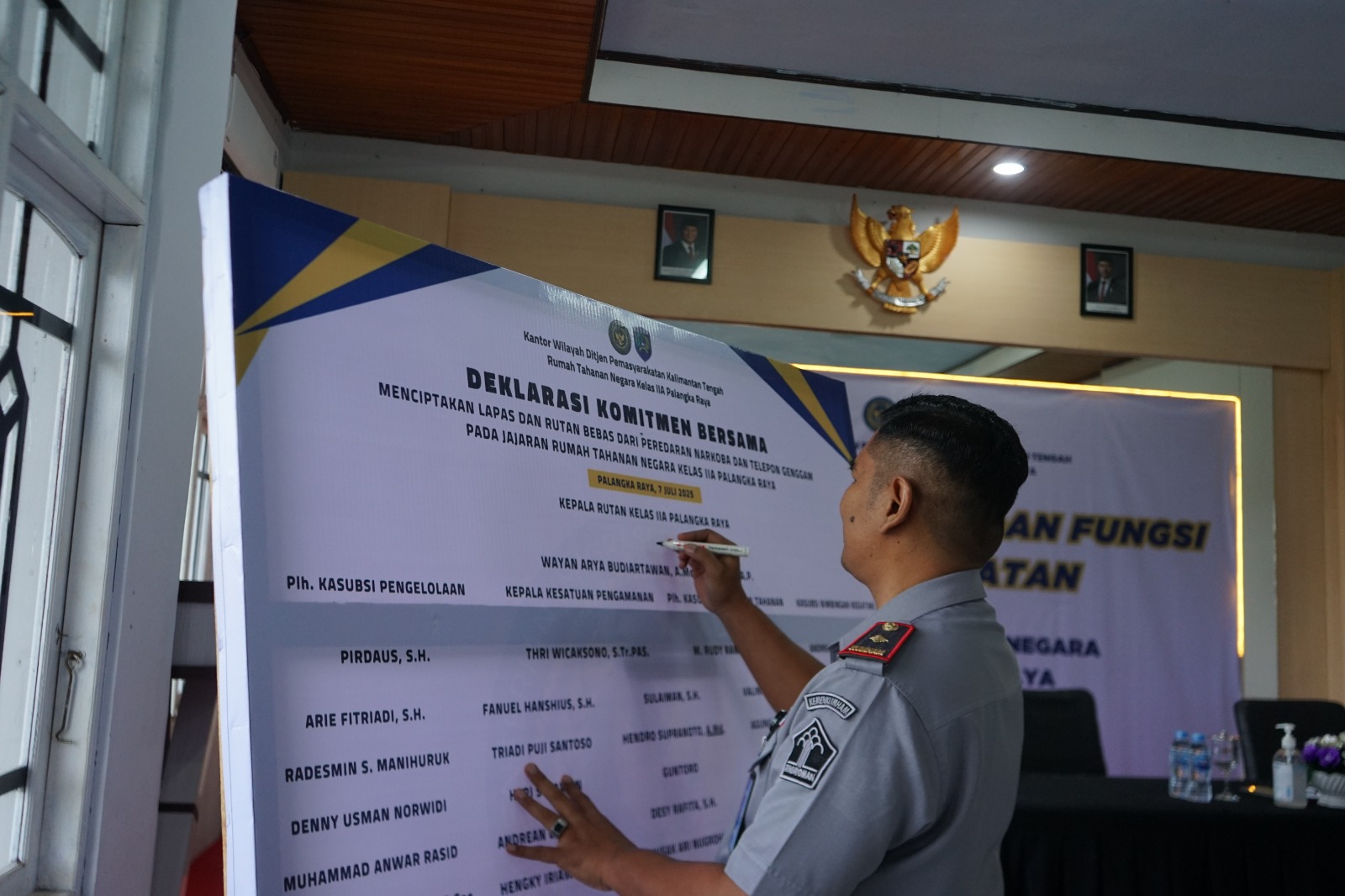 PALANGKA RAYA,inikalteng.com – Dalam rangka mewujudkan Lapas dan Rutan yang bebas dari peredaran narkoba dan penggunaan telepon genggam ilegal, Rutan Kelas IIA Palangka Raya laksanakan kegiatan Penandatanganan Komitmen disusul dengan penguatan tugas dan fungsi pemasyarakatan oleh Kepala Rutan Palangka Raya, Senin (7/7/2025), di aula Rutan Palangka Raya.