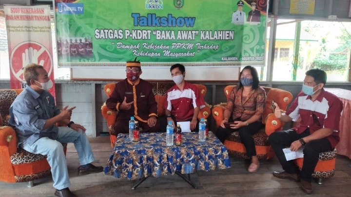 BUNTOK, inikalteng.com – Satuan Tugas Penghapusan Kekerasan Dalam Rumah Tangga (Satgas P-KDRT) Desa Kalahien menggelar Talk Show bersama warga setempat terkait Pemberlakuan Pembatasan Kegiatan Masyarakat (PPKM) oleh Pemerintah di Balai Desa Kalahien, Kecamatan Dusun Selatan (Dusel), Kabupaten Barito Selatan (Barsel), Kalimantan Tengah (Kalteng), Kamis (12/8/2021).