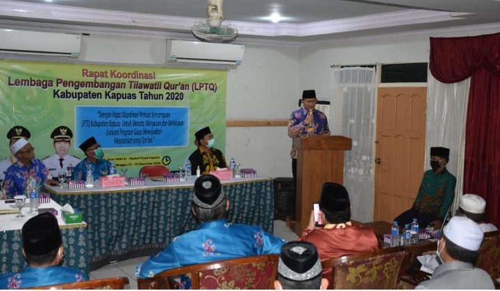 KUALA KAPUAS – Rapat Koordinasi (Rakor) Lembaga Pengembangan Tilawatil Qur’an (LPTQ) Kabupaten Kapuas Tahun 2020 resmi dimulai yang ditandai dengan dibukanya kegiatan tersebut oleh Bupati Kapuas Ben Brahim S Bahat melalui Sekretaris Daerah (Sekda) Kabupaten Kapuas Septedy di Aula Hotel Al-Madani Jalan Patih Rumbih Kuala Kapuas, Sabtu (12/12/2020) sore.