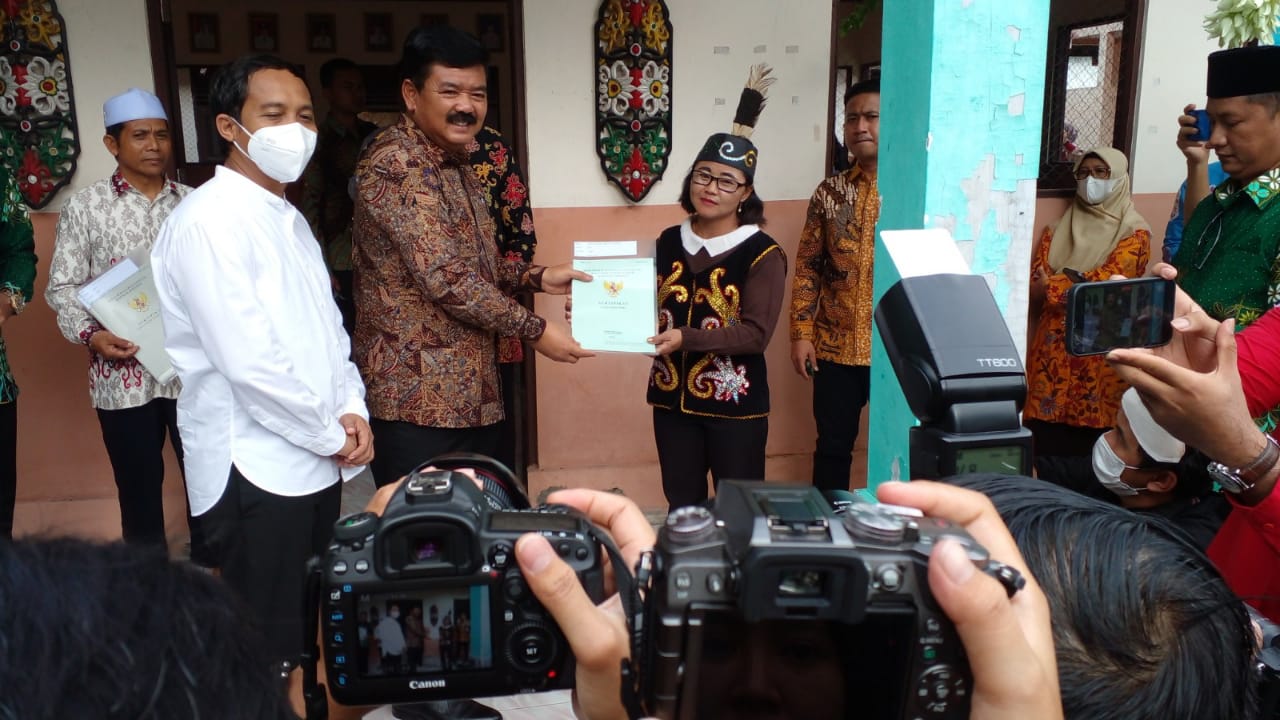 PALANGKA RAYA, inikalteng.com – Menteri Agraria dan Tata Ruang/Kepala Badan Pertanahan Nasional (ATR/BPN), Hadi Tjahjanto menyerahkan Sertifikat Tanah hasil program Pendaftaran Tanah Sistematis Lengkap (PTSL) di Kelurahan Banturung, Kecamatan Bukit Batu, Kota Palangkaraya, Provinsi Kalimantan Tengah pada Jumat (24/03/2023). Sertipikat yang diserahkan kali ini sebanyak 208 sertipikat yang diantarkan oleh Hadi Tjahjanto secara door to door kepada enam orang masyarakat.