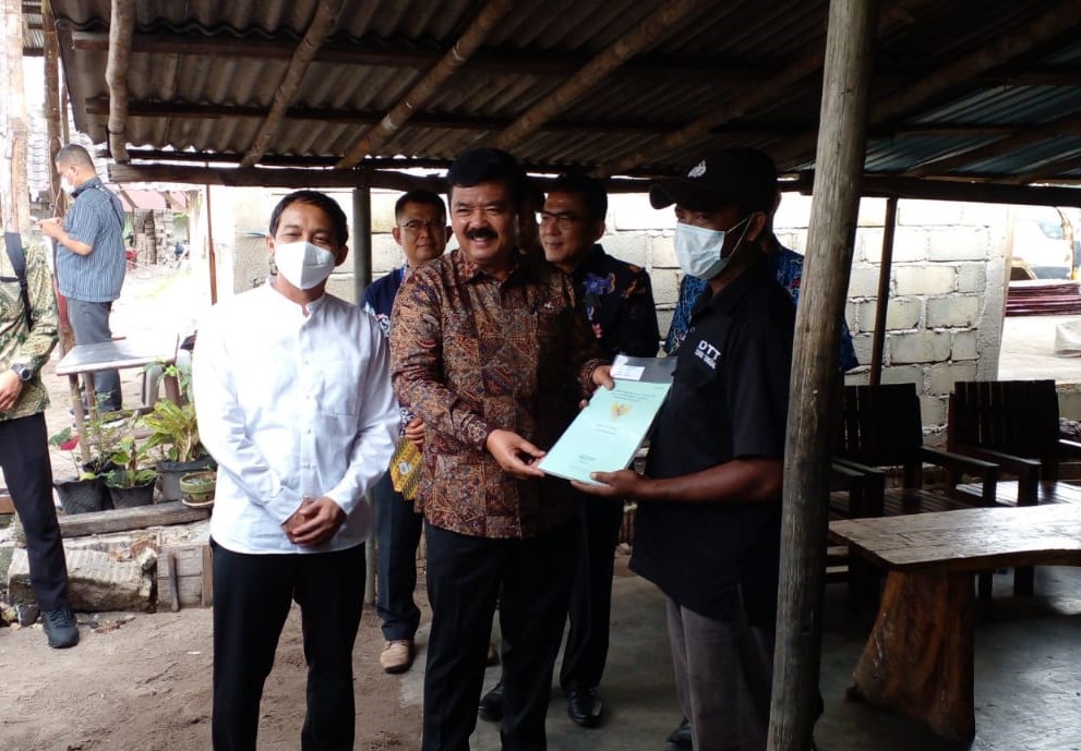 ” Saya baru saja menyerahkan 6 sertifikat secara door to door kepada masyarakat. Masyarakat disini rata-rata bekerja sebagai pengrajin bata merah, pengrajin arang, ubin ada juga yang bekerja di luar kota. Selanjutnya saya juga menyerahkan 5 sertifikat tanah wakaf dan tempat ibadah,” sebut Hadi Tjahjanto.