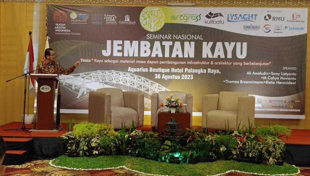 PALANGKA RAYA, inikalteng.com – Seminar Nasional Jembatan Kayu yang digagas oleh Ikatan Arsitektur Indonesia (IAI) Kalteng pada Rabu (30/8/2023), di salah satu hotel berbintang di Kota Palangka Raya, mengangkat kekhasan Kalimantan dalam perspektif arsitektur dan infrastruktur. Dalam seminar ini, kayu sebagai material pembangunan infrastruktur berkelanjutan jadi ulasan yang menarik.