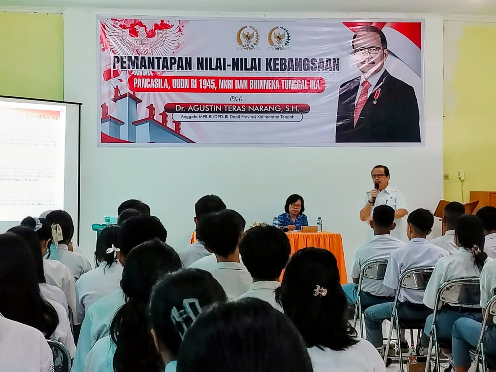 PALANGKA RAYA, inikalteng.com – Anggota MPR RI dari unsur DPD, Agustin Teras Narang, kembali menegaskan urgensi penguatan nilai-nilai kebangsaan bagi generasi muda di tengah pesatnya perkembangan teknologi digital. Pesan tersebut ia sampaikan saat memberikan sosialisasi empat konsensus dasar kebangsaan kepada siswa SMA Katolik Santo Petrus Kanisius Palangka Raya, Senin (17/11/2025).