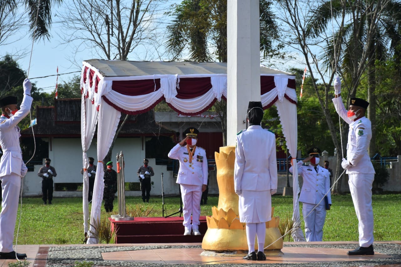 Upacara berlangsung terbatas dengan menerapkan protokol kesehatan secara ketat dengan disiarkan secara streaming bertempat di Halaman Kantor Bupati Kapuas, Jalan Pemuda, km 5,5, Selasa (17/8/2021) pagi.